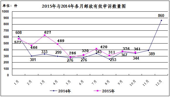 2015年10月,消费者关于邮政服务问题的有效申诉361件,环比下降4.0%,同比增长4.9%。