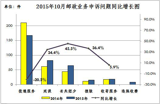 2015年10月,邮政业务的邮件丢失短少、损毁、延误和收寄服务问题同比呈增长趋势,分别增长45.5%、36.4%、34.4%和5.9%,投递服务问题同比下降20.5%。