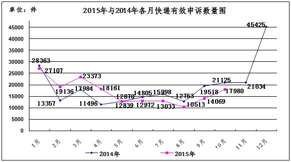 2015年10月,消费者关于快递业务的有效申诉17980件,环比增长27.8%,同比下降14.9%。