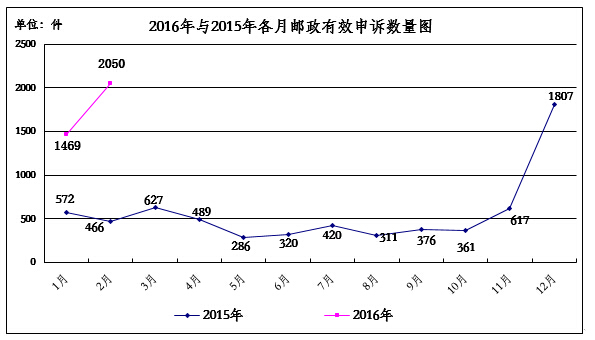 2016年2月,消费者关于邮政服务问题的有效申诉2050件,环比增长39.6%,同比增长339.9%。