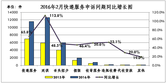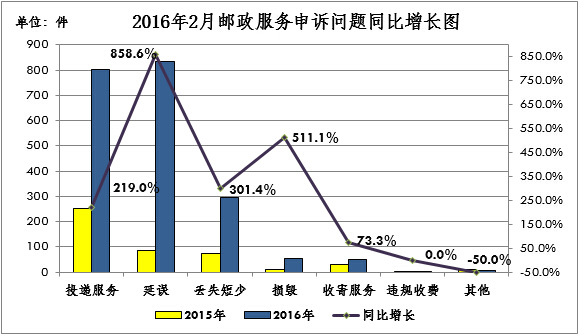 2016年2月,邮政服务的主要问题同比呈增长趋势,邮件延误、邮件损毁、邮件丢失短少、投递服务和收寄服务,分别增长858.6%、511.1%、301.4%、219.0%和73.3%。