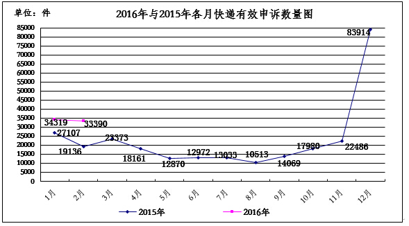 2016年2月,消费者关于快递服务的有效申诉33390件,环比下降2.7%,同比增长74.5%。