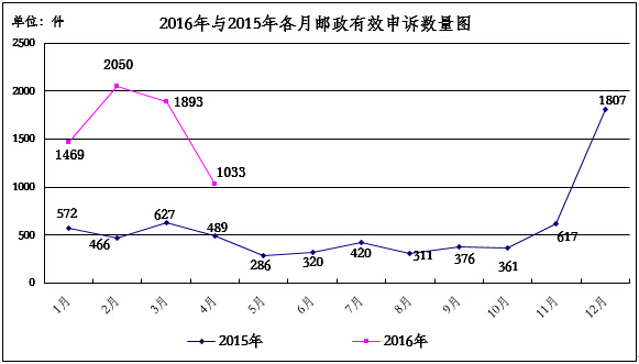2016年4月,消费者关于邮政服务问题的有效申诉1033件,环比下降45.4%,同比增长111.2%。