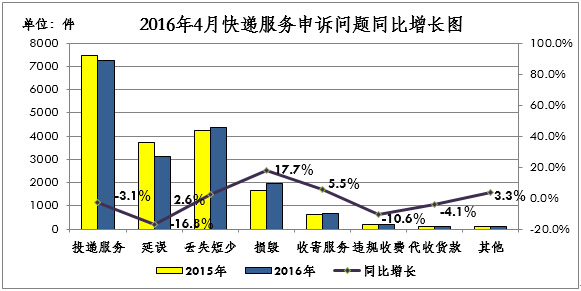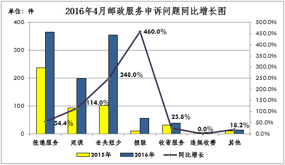 2016年4月,消费者对邮政服务的申诉同比呈大幅增长趋势,其中邮件损毁、邮件丢失短少、邮件延误、投递服务和收寄服务,分别增长460%、248.0%、114.0%、54.4%和25.8%。