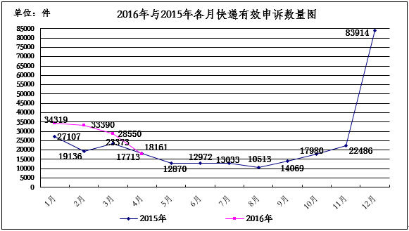 2016年4月,消费者关于快递服务的有效申诉17713件,环比下降38.0%,同比下降2.5%。