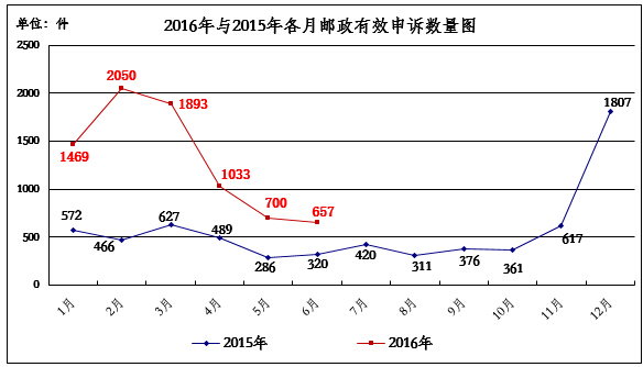 2016年6月,消费者关于邮政服务问题的有效申诉657件,环比下降6.1%,同比增长105.3%。