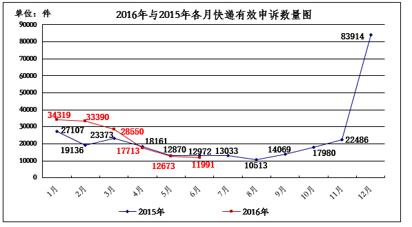 2016年6月,消费者关于快递服务的有效申诉11991件,环比下降5.4%,同比下降7.6%。