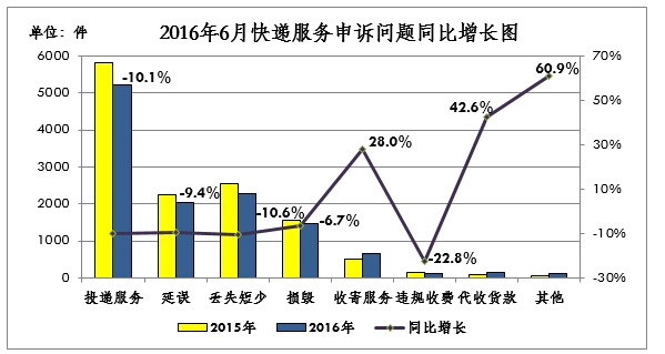 2016年6月,消费者申诉邮政服务的邮件延误、邮件丢失短少与上月比较小幅下降,但与去年同期相比仍大幅增长,邮件损毁、邮件丢失短少、收寄服务、邮件延误、投递服务,分别增长685.7%、172.7%、138.9%、107.9%、61.4%。