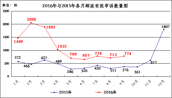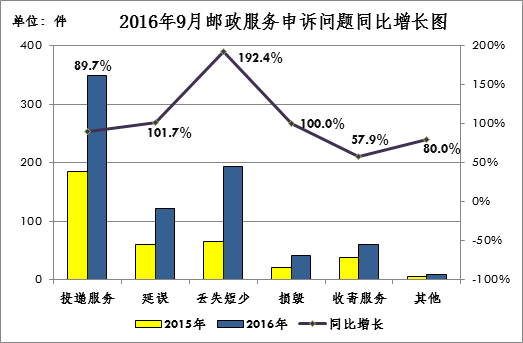 2016年9月,消费者关于邮政服务问题的有效申诉774件,环比增长8.6%,同比增长105.9%。