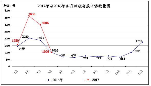 2017年4月,消费者关于邮政服务问题的有效申诉1029件,环比下降65.8%,同比下降0.4%。