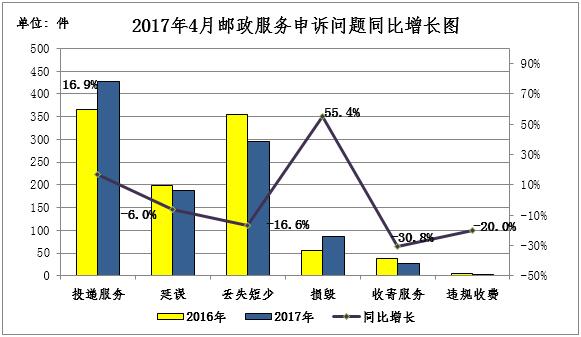 2017年4月,消费者对邮政服务申诉的主要问题与上月相比呈下降趋势。与去年同期相比,邮政服务主要问题增长的有邮件损毁和投递服务,同比分别增长55.4%和16.9%。
