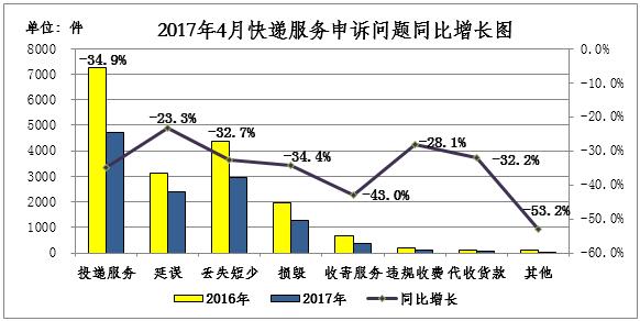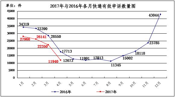 2017年4月,消费者关于快递服务的有效申诉11940件,环比下降46.6%,同比下降32.6%。