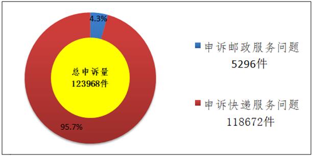 2017年7月,国家邮政局和各省(区、市)邮政管理局通过“12305”邮政行业消费者申诉电话和申诉网站共受理消费者申诉123968件。申诉中涉及邮政服务问题的5296件,占总申诉量的4.3%;涉及快递服务问题的118672件,占总申诉量的95.7%。