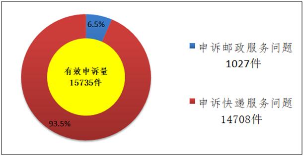 受理的申诉中有效申诉(确定企业责任的)为15735件,比上年同期增长15.8%。有效申诉中涉及邮政服务问题的1027件,占有效申诉量的6.5%;涉及快递服务问题的14708件,占有效申诉量的93.5%。