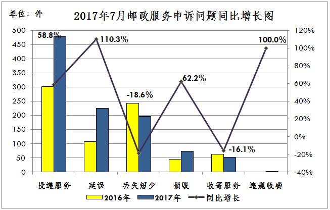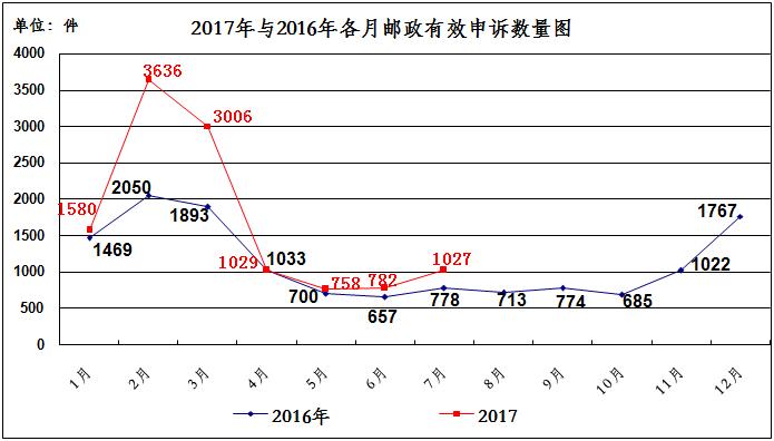 2017年7月,消费者关于邮政服务问题的有效申诉1027件,环比增长31.3%,同比增长32.0%。