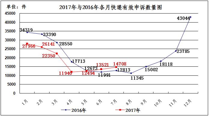 2017年7月,消费者关于快递服务的有效申诉14708件,环比增长8.8%,同比增长14.8%。