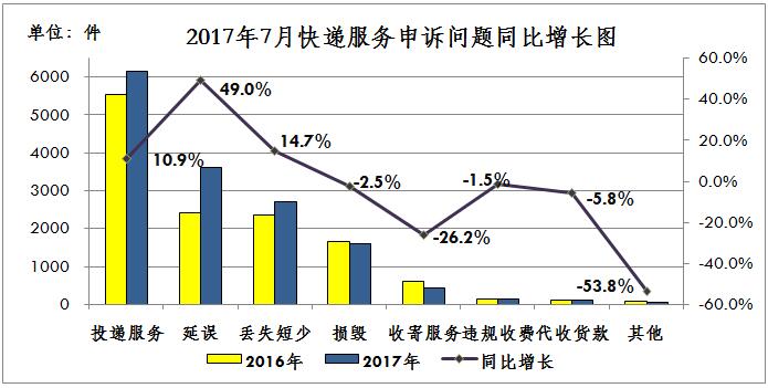 2017年7月,消费者申诉邮政服务的主要问题是投递服务,占申诉总量的46.5%。