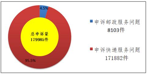 2017年9月,国家邮政局和各省(区、市)邮政管理局通过“12305”邮政行业消费者申诉电话和申诉网站共受理消费者申诉179985件。申诉中涉及邮政服务问题的8103件,占总申诉量的4.5%;涉及快递服务问题的171882件,占总申诉量的95.5%。