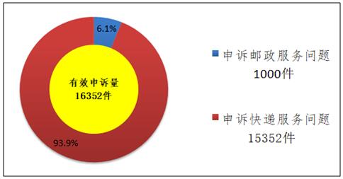 受理的申诉中有效申诉(确定企业责任的)为16352件,比上年同期增长3.7%。有效申诉中涉及邮政服务问题的1000件,占有效申诉量的6.1%;涉及快递服务问题的15352件,占有效申诉量的93.9%。