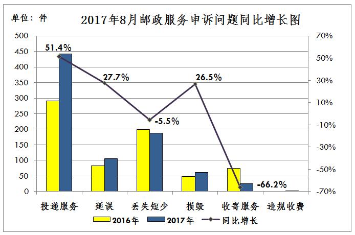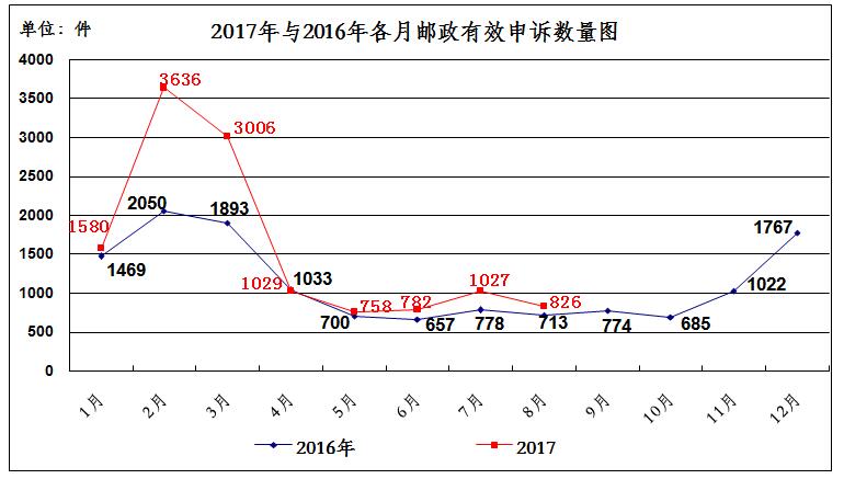 2017年8月,消费者关于邮政服务问题的有效申诉826件,环比下降19.6%,同比增长15.8%。