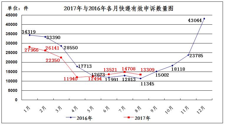 2017年8月,消费者关于快递服务的有效申诉13309件,环比下降9.5%,同比增长17.3%。