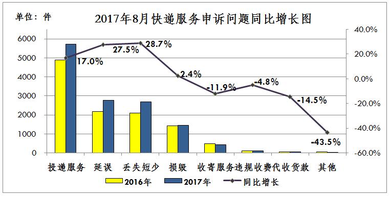 2017年8月,消费者对快递服务申诉的主要问题的与上月相比增长的有收寄服务和丢失短少。与去年同期相比,快递服务主要问题增长的有丢失短少、延误、投递服务和损毁,分别增长28.7%、27.5%、17.0%和2.4%。申诉比较集中的问题是投递服务、延误和丢失短少,占比分别为43.0%、20.9%和20.2%。