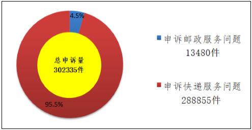 2017年12月,国家邮政局和各省(区、市)邮政管理局通过“12305”邮政行业消费者申诉电话和申诉网站共受理消费者申诉302335件。申诉中涉及邮政服务问题的13480件,占总申诉量的4.5%;涉及快递服务问题的288855件,占总申诉量的95.5%。