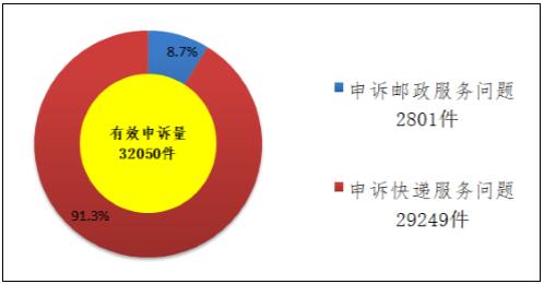 受理的申诉中有效申诉(确定企业责任的)为32050件,比上年同期下降28.5%。有效申诉中涉及邮政服务问题的2801件,占有效申诉量的8.7%;涉及快递服务问题的29249件,占有效申诉量的91.3%。