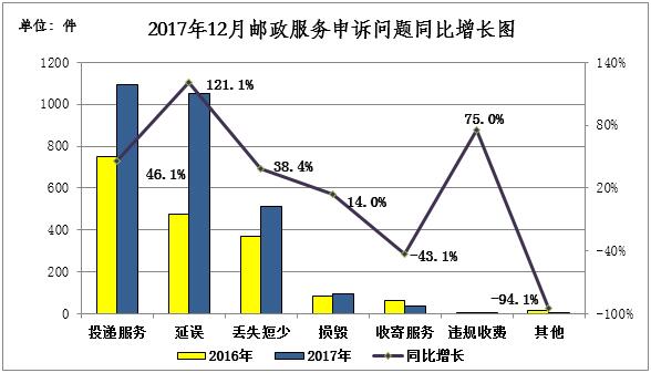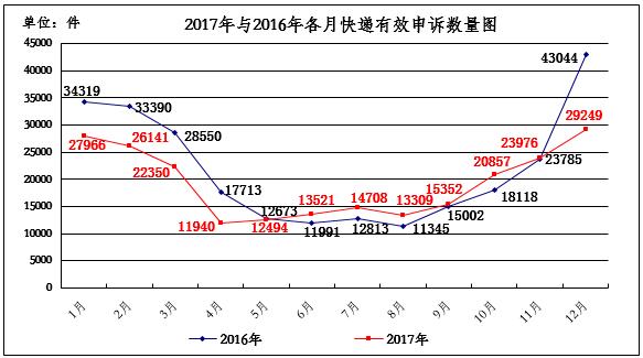 2017年12月,消费者关于邮政服务问题的有效申诉2801件,环比增长72.8%,同比增长58.5%。