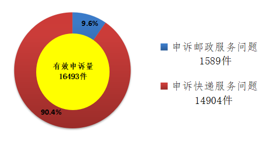 处理的申诉中,有效申诉量(确定企业责任的)为16493件,比上年同期下降70.1%。有效申诉量中涉及邮政服务问题的1589件,占有效申诉量的9.6%;涉及快递服务问题的14904件,占有效申诉量的90.4%。