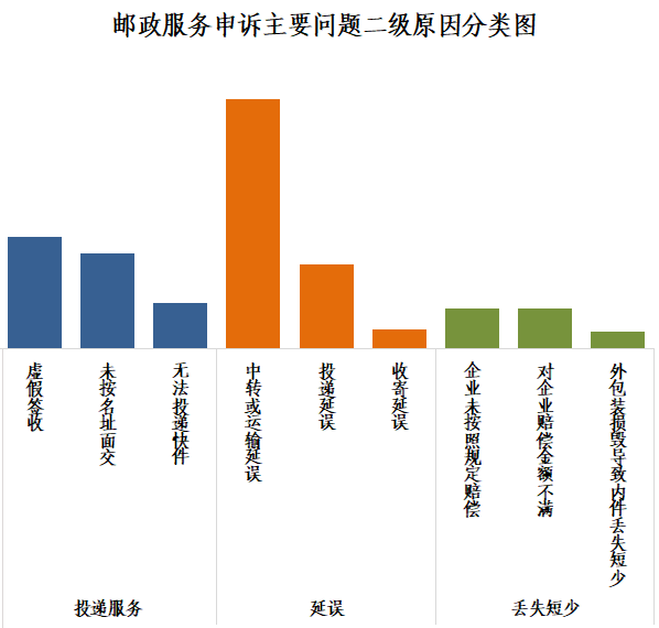 邮政服务申诉的主要问题是投递服务、邮件延误和邮件丢失短少,分别占申诉总量的36.1%、30.6%和21.5%。其中,环比增长明显的是邮件丢失短少和投递服务问题。