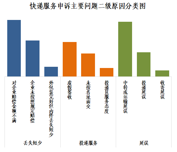 快件丢失短少中主要占比是对企业赔偿金额不满,投递服务中主要占比是虚假签收,快件延误中主要占比是中转或运输延误。