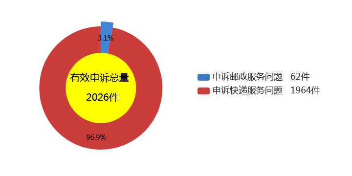 2.受理的申诉中有效申诉(确定企业责任的)为2026件,环比增长11%,同比增长3.7%。有效申诉中涉及邮政服务问题的62件,占有效申诉量的3.1%,环比增长37.8%,同比增长8.8%;涉及快递服务问题的1964件,占有效申诉量的96.9%,环比增长10.3%,同比增长3.5%。