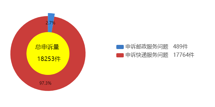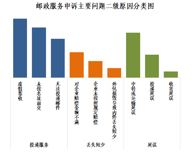 邮政服务申诉的主要问题是投递服务、邮件丢失短少和邮件延误,分别占申诉总量的50.1%、20%和18.4%,环比均下降明显,同比增长明显的是投递服务问题。