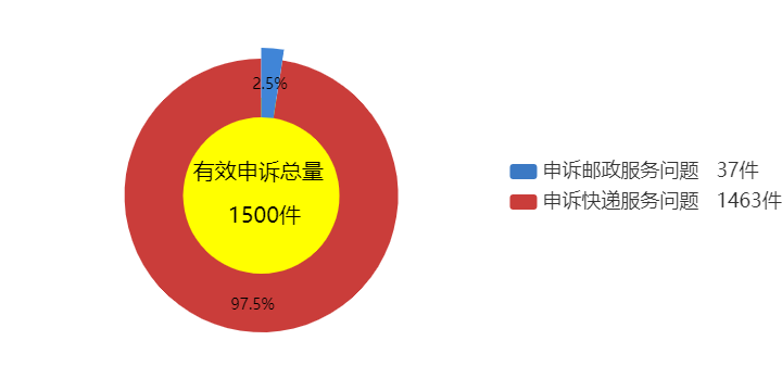 2.受理的申诉中有效申诉(确定企业责任的)为1500件,环比下降41.3%,同比下降38.9%。有效申诉中涉及邮政服务问题的37件,占有效申诉量的2.5%,环比下降36.2%,同比下降31.5%;涉及快递服务问题的1463件,占有效申诉量的97.5%,环比下降41.4%,同比下降39%。