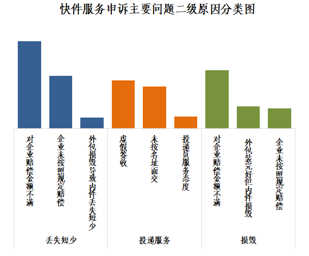 快件丢失短少申诉中主要占比是对企业赔偿金额不满,投递服务申诉中主要占比是虚假签收,快件损毁申诉中主要占比是对企业赔偿金额不满。