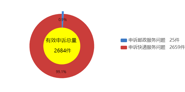 2.受理的申诉中有效申诉(确定企业责任的)为2684件,环比增长37.4%,同比增长96.6%。有效申诉中涉及邮政服务问题的25件,占有效申诉量的0.9%,环比下降46.8%,同比下降32.4%;涉及快递服务问题的2659件,占有效申诉量的99.1%,环比增长39.5%,同比增长100.2%。