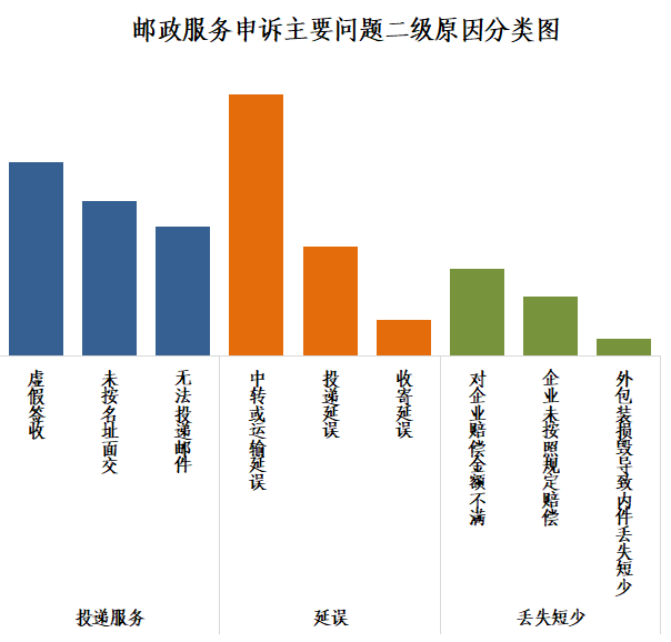 投递服务申诉中主要占比是虚假签收,邮件延误申诉中主要占比是中转或运输延误,邮件丢失短少申诉中主要占比是对企业赔偿金额不满。